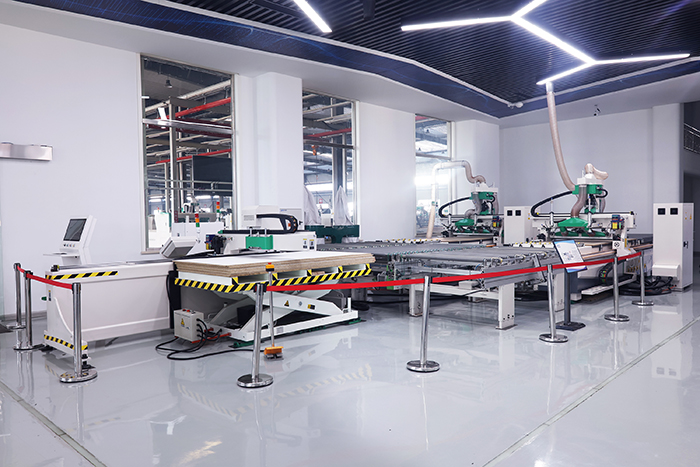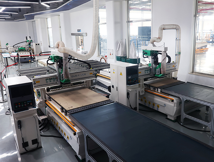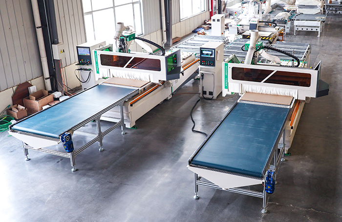 品脈數(shù)控一拖二智能開料單元是一套自動化程度比較高的數(shù)控開料解決方案。開料單元由一臺高速自動貼標機、兩臺全自動數(shù)控開料中心以及動力滾筒線、中控系統(tǒng)組成。人工只需將板材放置在升降機上,由貼標機自動貼標,再由中控系統(tǒng)自動分配至開料中心,完成板材切割工作。如選配機器人系統(tǒng),可由機器人完成碼垛,余料利用及廢料輸出等工作。