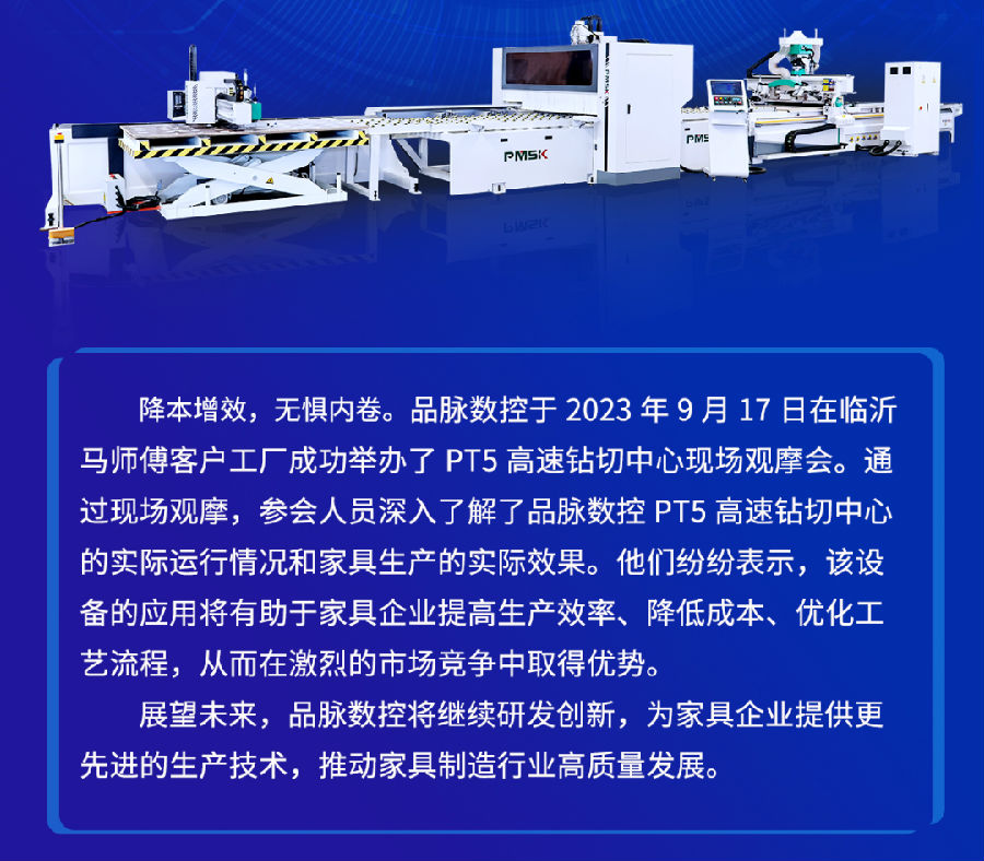 臨沂馬師傅家居有限公司是一家專(zhuān)注于板式家具制造的公司。2023年4月的臨沂展會(huì)期間訂購(gòu)了品脈數(shù)控的PT5高速鉆切中心。此前,馬師傅工廠使用著開(kāi)料機(jī)、封邊機(jī)和側(cè)孔機(jī)進(jìn)行生產(chǎn),每天的產(chǎn)能只有40張板。然而,伴隨著訂單量的增加,工廠的產(chǎn)能遠(yuǎn)遠(yuǎn)達(dá)不到生產(chǎn)需求。為了解決這個(gè)問(wèn)題,馬總決定擴(kuò)充更新設(shè)備。馬總偶然間看到了我們的PT5高速鉆切中心的加工視頻,并對(duì)其加工模式產(chǎn)生了濃厚的興趣。于是,馬師傅在今年四月份前往臨沂展會(huì),通過(guò)詳細(xì)了解PT5的生產(chǎn)模式和設(shè)備優(yōu)勢(shì)之后,決定訂購(gòu)該臺(tái)設(shè)備。該設(shè)備于五月份正式投產(chǎn)使用。投產(chǎn)后,馬師傅工廠的日產(chǎn)能從原先的40張板增加到了現(xiàn)在的140張板,產(chǎn)能提高了3倍多。并且PT5整臺(tái)設(shè)備只需要一個(gè)人工便能夠輕松操作,大大降低了人工成本、生產(chǎn)成本,實(shí)現(xiàn)了效率翻倍。