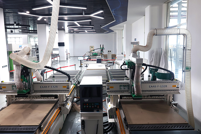 3,同一訂單可以快速推進,中控系統(tǒng)自動分配板材進入可加工工位,有效推進同批次同訂單同花色板材依次加工。