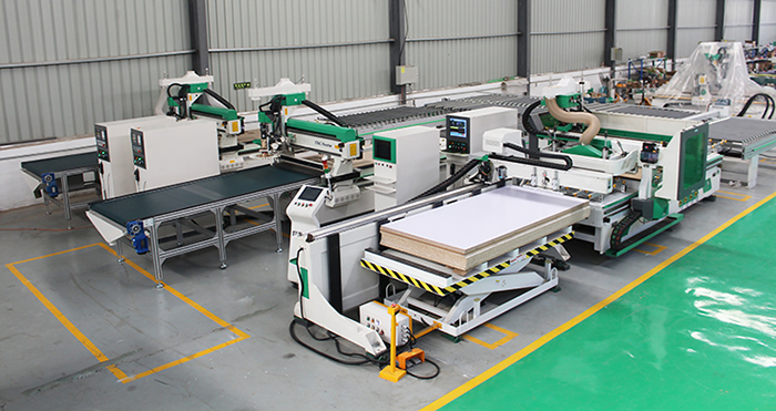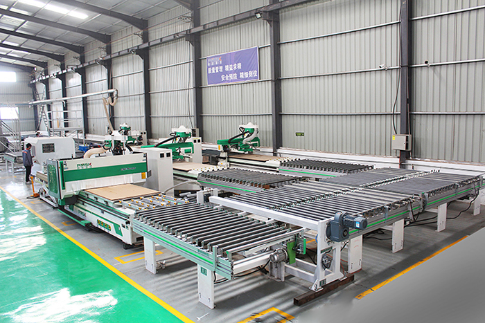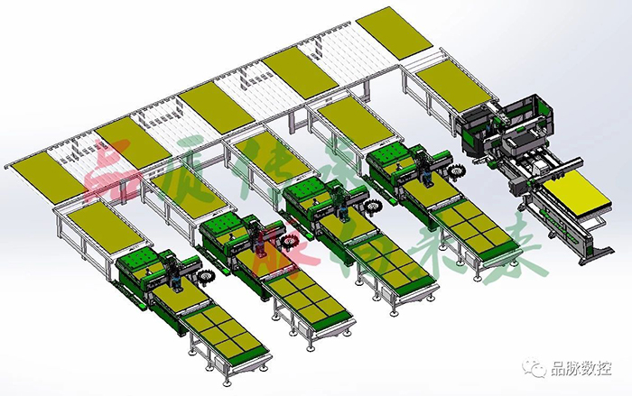 品脈模壓門板生產(chǎn)線采用1拖4(1拖3或1拖2)的搭配方式,是針對于模壓門板批量化生產(chǎn)的自動化解決方案。主要實現(xiàn)在門板背面完成自動貼標(biāo)(或激光打標(biāo)),打鎖孔,玻璃門加工。整板翻板、分配、輸送到正面加工機(jī)器,完成門板正面造形加工。完成后機(jī)器自動把材料傳送到下料臺上,由人工或機(jī)械手分撿,日產(chǎn)量可達(dá)到280-320平方。